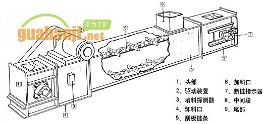 如圖所示,埋刮板輸送機由頭部,加卸料口,刮板鏈條,中間段、過濾段、尾部等零部件組成。